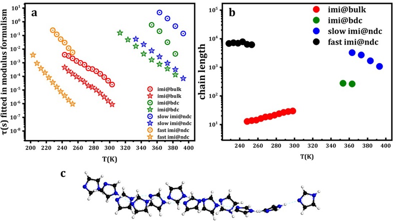 进一步得到研究松弛时间的温度依赖性,通过与本体咪唑的松弛相比,孔道内受限的慢速咪唑的动力学要慢的多;而快速咪唑的动力学却比本体咪唑还快上1-2个数量级。由结构松弛和Debye松弛可以得到咪唑超分子链链长的估计,结果发现,受限态与本体相比,超分子链长都有不同程度的提高,使得质子传输的有效距离得到显著提升,一定程度上贡献了材料优异的质子导电率(图3)。