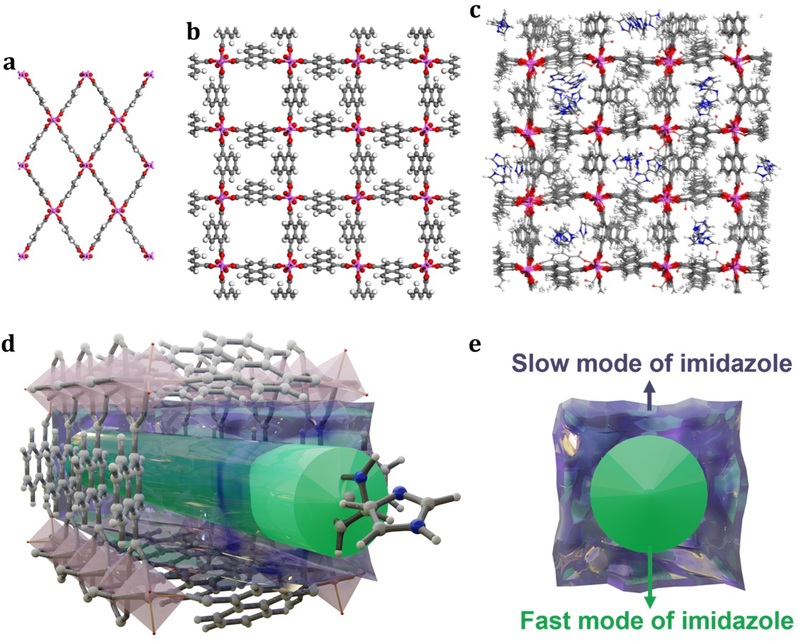 图1 模型框架体系的孔道结构以及受限咪唑分子的非匀质结构和动力学。