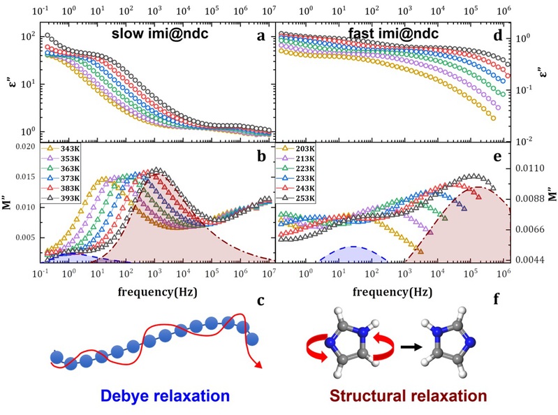 宽频介电谱技术能够在极宽的时间(能量)尺度表征材料的松弛动力学过程,在这个材料体系成功观察到了咪唑超分子组装体的两种松弛模式:1)咪唑自身结构松弛;2)咪唑-咪唑之间通过氢键连接形成的超分子链的整链松弛(Debye松弛),分别对应于上图中红色和蓝色的介电松弛峰(图2)。除此之外,通过在极宽的温度表征模型体系,两组松弛模式也分别在低温和高温被观察到,证明了在孔道中存在两类不同的咪唑。咪唑处于不同的化学(物理)环境,从而展现出截然不同的动力学过程(图1)。