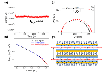 成功地建立了具有离子通道的有序结构,赋予了高转移数的优良离子传导性。这里选择T16-AgPW,并用恒电位极化法进行测试,得出Ag+的迁移数tAg+为0.93,这与许多报道的单离子SSEs的特征一致。在我们的PNC SSEs中,阳离子沿着由密集的无机穴醚分子(MPW)组成的离子通道传输,而由MPW代表的阴离子是不动的,几乎没有对离子传导的贡献。这种设计最终导致了SSEs的单离子传导特征。而且,与典型的聚合物SSEs中的离子传输不同,体系中的阳离子是在无机相MPW构筑的离子通道中传输的,阳离子实际上不与有机相相互作用,例如表面活性剂-Ag系统中的表面活性剂烷基链(图2d),这为解决SSEs的离子传导性和机械性能之间的权衡问题提供了巨大的机会。