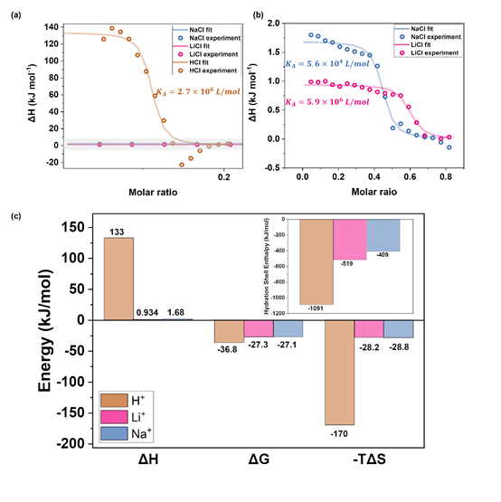 图4,(a)不同反离子滴定PEY溶液的ITC数据及拟合曲线,(b)放大后的(a)灰色区域,(c)拟合获得的热力学参数,其中插图为氢离子,锂离子,钠离子各自的水合焓。