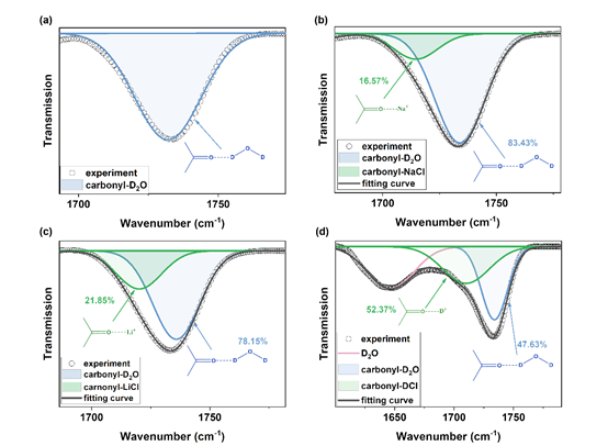 图3,加入反离子的聚电解质溶液红外谱图及其高斯峰拟合,(a)纯PEY溶液,(b)加入钠离子的PEY溶液,(c)加入锂离子的PEY溶液,(d)加入氢离子的PEY溶液。