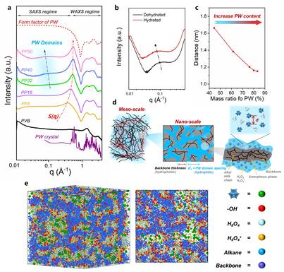 近日,华南理工大学殷盼超教授团队采用无机-有机杂化策略通过超分子相互作用将商用无氟聚合物聚乙烯醇丁醛(PVB)与超酸性纳米金属氧簇H3PW12O40 (PW)轻松络合制备的纳米复合材料用作PEM。两种组分之间的强亲和性使得所获得的纳米复合材料具有两亲性,并进一步相分离成具有相互连接的质子传输通道和坚固的聚合物骨架的双连续结构,从而实现了复合材料高的质子电导率,机械/尺寸稳定性和屏障性能,并且装配复合PEM的H2/O2 FC具有良好的功率密度和长期稳定性。有趣的是,由于易于络合的策略和杂化材料优异的力学性能,通过典型的带式铸造技术,可以在具有挑战性的~ 10 um厚度下连续大规模制造杂化PEM。这项工作不仅为商用PEM提供了潜在的材料体系,还提高了人们对纳米复合功能材料的研究兴趣。