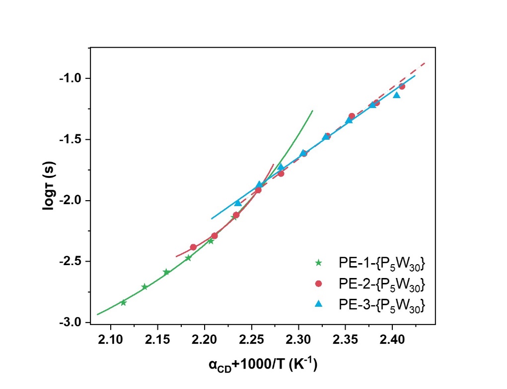 接下来,作者使用宽频介电谱(BDS)深入研究了该体系的松弛动力学,该技术能够灵敏地探测链段在不同温度和频率下的松弛过程并覆盖极宽的频率范围。对于纯聚电解质:电荷密度较低的PE-1和PE-2只显示一个对应于链段协同运动的α松弛过程,其松弛时间随温度的变化符合高分子体系中典型的Vogel-Fulcher-Tammann(VFT)关系。而高电荷密度的PE-3由于结构微不均一性,出现了额外的松弛过程。有趣的是,复合后所有样品都只观察到一个单一的α松弛峰,且松弛过程显著变慢。这说明{P5W30}的引入“均质化”了链段动力学,强烈的相互作用成为主导因素。
