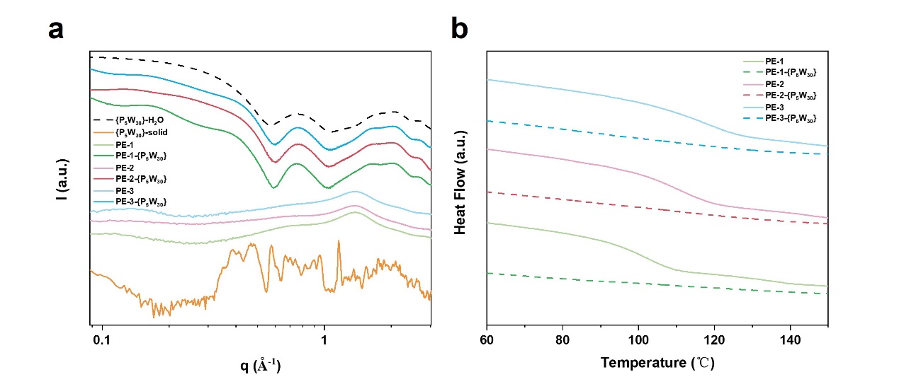 图2,(a)复合材料,聚电解质,多酸的SAXS图谱以及多酸的理论散射曲线。(b)复合材料与纯聚电解质的DSC数据。