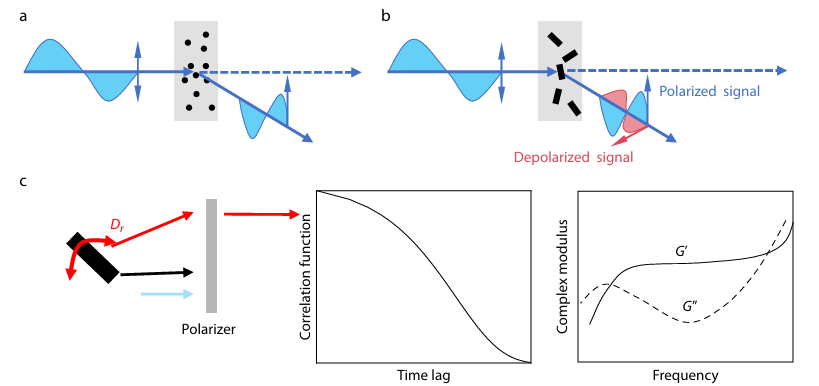图1 a各向同性粒子的散射示意图; b各向异性粒子的散射示意图; c微流变原理示意图。