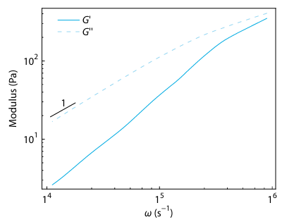 文章系统研究了实验过程中散射角度组合以及示踪粒子尺寸对微流变结果的影响,同时给出了适应于绝大多数商业化多角度动态光散射仪器的角度组合(60度与130度)。随着两个散射角度差值的减小,实验数据的有效频率区间也不断被压缩,因此实验中散射角度差值越大,频率范围越宽。针对示踪粒子尺寸,实验表明较大的示踪粒子给出的流变主曲线在低频处有更多的信息(图3);然而,实际试验中对示踪粒子尺寸的选取需要综和考虑多种影响:如示踪粒子尺寸需要大于基底的特征长度,流变实验的目标频率区间。