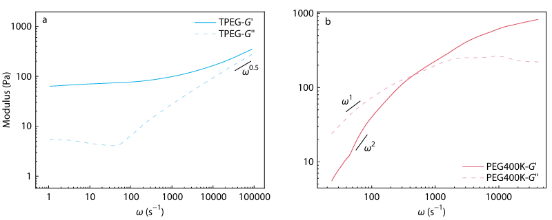 图2 a非遍历性水凝胶样品的微流变结果; b聚合物溶液的微流变结果。
