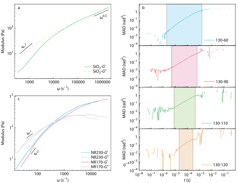 基于上述背景,华南理工大学殷盼超教授课题组采用去偏振动态光散射和各向异性示踪粒子,开发了一种新型微流变技术。由于各向异性颗粒会改变散射光的偏振方向,通过在检测器前加装偏振片,可以规避基底散射信号,只检测示踪粒子的散射信号,得到均方角位移。再通过广义斯托克斯-爱因斯坦方程得到流变主曲线。(图1)。
