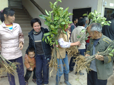 领到果树村民满怀喜悦 | | 村民搬运果苗 |