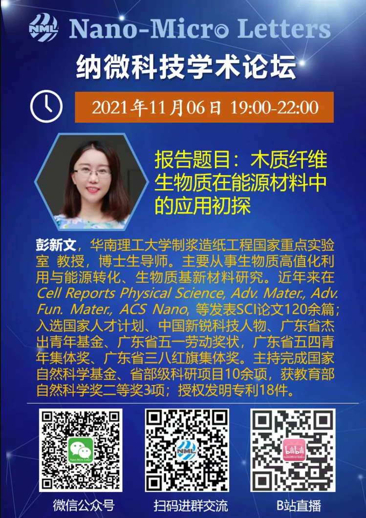 2021年11月6日,由Wiley出版社及上海交通大学共同主办的Nano-Micro Letters纳微科技学术论坛在广州举办。彭新文教授受邀以线上形式进行报告,题目为《木质纤维生物质在能源材料中的应用初探》。