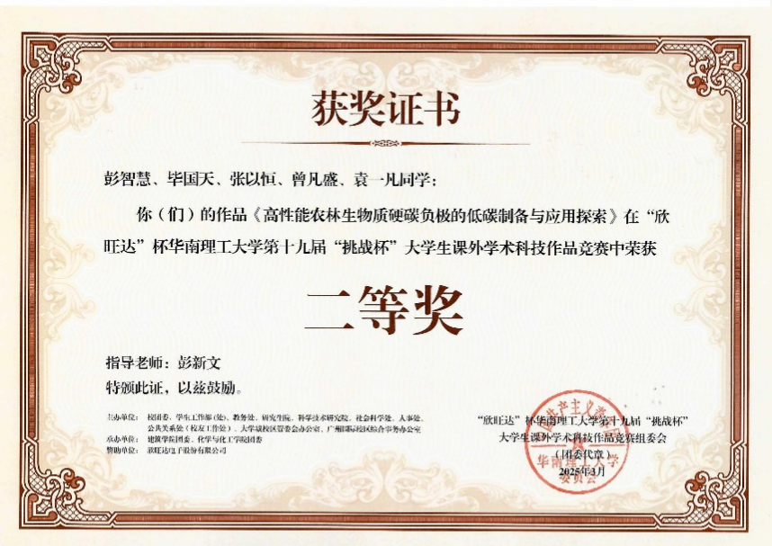 祝贺我组作品《高性能农林生物质硬碳负极的低碳制备与应用探索》荣获“欣旺达”杯华南理工大学第十九届“挑战杯”大学生课外学术科技作品竞赛二等奖。