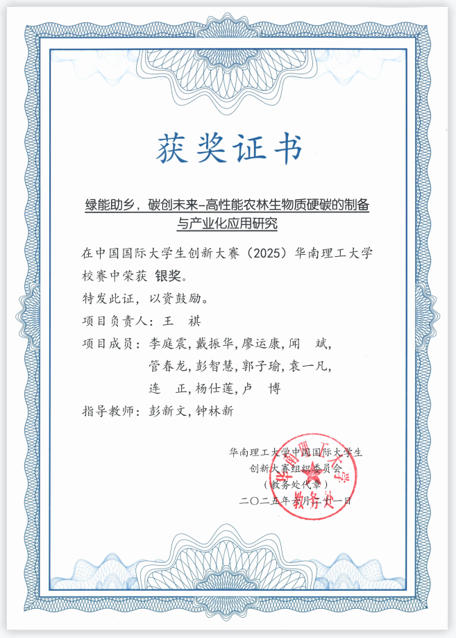 本项目由轻工科学与工程学院彭新文教授、钟林新教授指导,2023级博士研究生王祺带队完成的作品《绿能助乡,碳创未来——高性能农林生物质硬碳的制备与产业化应用研究》,在中国国际大学生创新大赛华南理工大学校赛中荣获银奖。这一成果不仅展现了我组团队在绿色能源与生物质高值化利用方面的创新实力,也彰显了师生团队协同攻关、产学研结合的育人成果。
