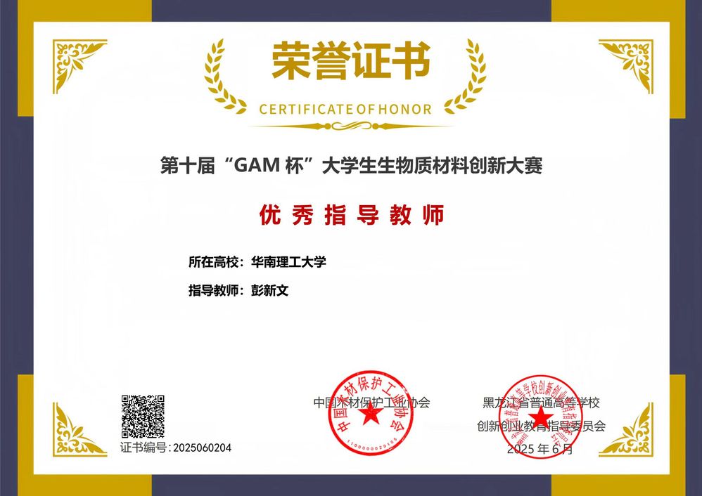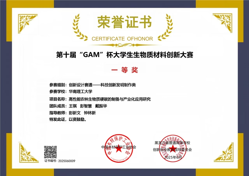 祝贺我组作品《高性能农林生物质硬碳的制备与产业化应用研究》荣获第十届“GAM”杯大学生生物质材料创新大赛一等奖,祝贺彭新文老师在第十届“GAM 杯”大学生生物质材料创新大赛中获得优秀指导教师称号。