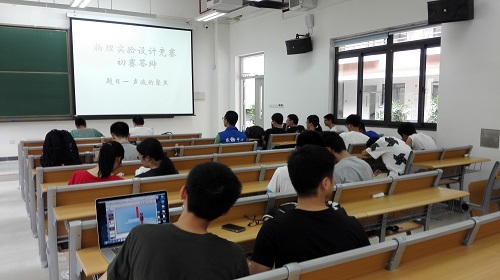 此次初赛赛题共有两个:声波的聚焦装置的设计和光测量装置的设计,两个赛题的答辩分别在两个课室举行。