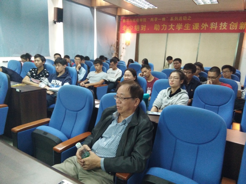 本次活动得到了我们物理与光电学院关工委的大力支持,也很荣幸能邀请到几位教学实践经验丰富、视野开阔的退休老前辈来引导大学生开展科技创新教育活动。他们分别是学院关工委常务副主任张小康老师、学院关工委学生课外科技活动指导组组长郑学仁老师、学校关工委阳光成长团队顾问叶英模老师。此外,参加本次活动的学生有在课外科技创新活动的积极分子和准备参加中国大学生物理学术竞赛的代表等,由曾嘉华副书记主持此次活动。