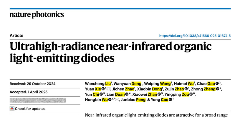 近日,学院吴宏滨教授课题组在国际著名期刊Nature Photonics (《自然·光子学》)上发表题为“Ultrahigh-radiance near-infrared organic light-emitting diodes” (超高辐射亮度的近红外有机发光二极管)的研究论文。该论文提出了抑制有机发光二极管发光效率滚降的新策略,通过降低长寿命三重态激子对单重态激子的猝灭,将器件在直流和脉冲驱动下的临界电流密度分别提高到100 A/cm2和10 kA/cm2量级,实现了亮度达到地表太阳辐照水平147倍的超高亮度近红外电致辐射。