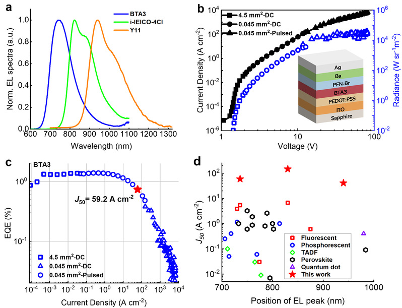 图1. (a) 器件的电致发光光谱。 (b) BTA3的器件电流密度-电压-辐射度特性。(c) 器件的外量子效率-电流密度特性。 (d)文献报道中不同种类的近红外发光器件临界驱动电流密度水平的比较。