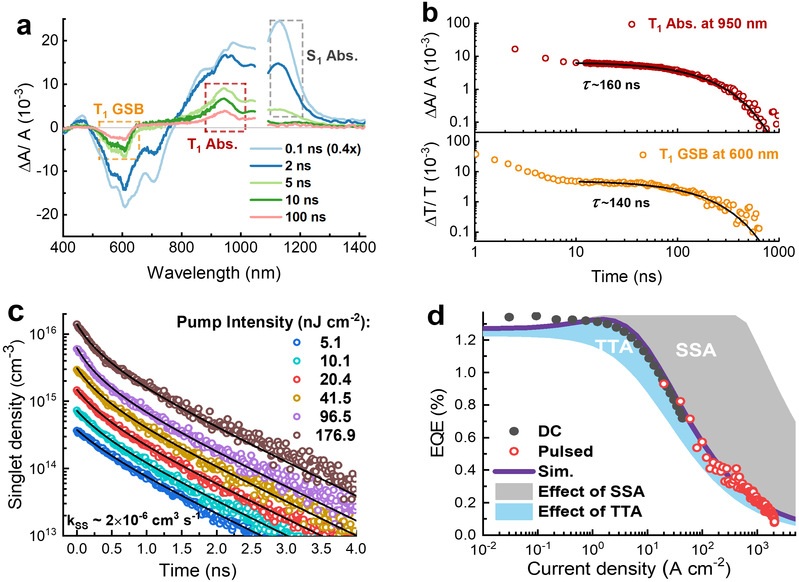 图2. (a) 红外发光材料BTA3在溶液状态下的瞬态吸收光谱。(b) 通过单指数拟合提取的三重态激子寿命(约为140~160 ns)。(c) 泵浦强度依赖的单重态激子衰退曲线。(d) 有机近红外发光器件效率滚降特性及其动力学仿真。