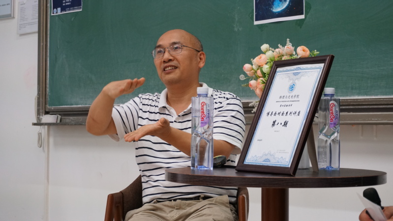 出席本次讲座的嘉宾有物理与光电学院博士生导师彭健新教授以及学院辅导员王艺翔老师。此次讲座的主题是“树立奋斗目标,感受大师风采”。主持人介绍了到场的嘉宾,此次讲座流程分为大咖分享和座谈会环节。随后彭健新教授上台开始分享他的科研经验与成果。