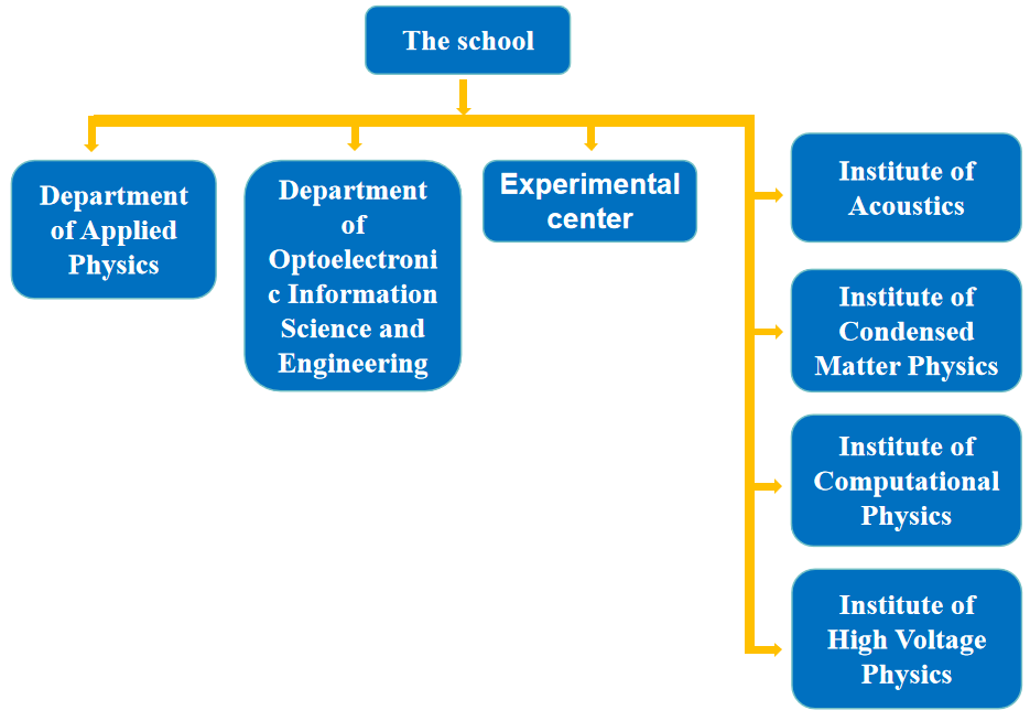 The college has two departments (Department of Applied Physics and Department of Optoelectronic Information Science and Engineering), one experimental center, and four research institutes (Institute of Acoustics, Institute of Condensed Matter Physics, Institute of Computational Physics, and Institute of High Voltage Physics).