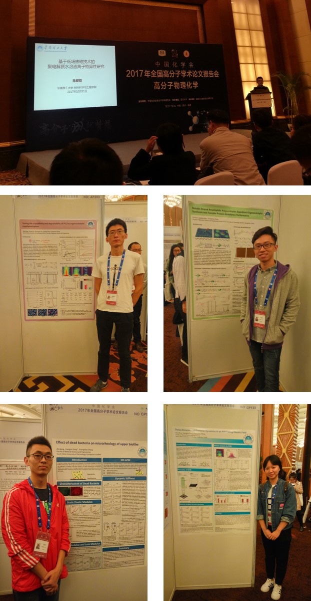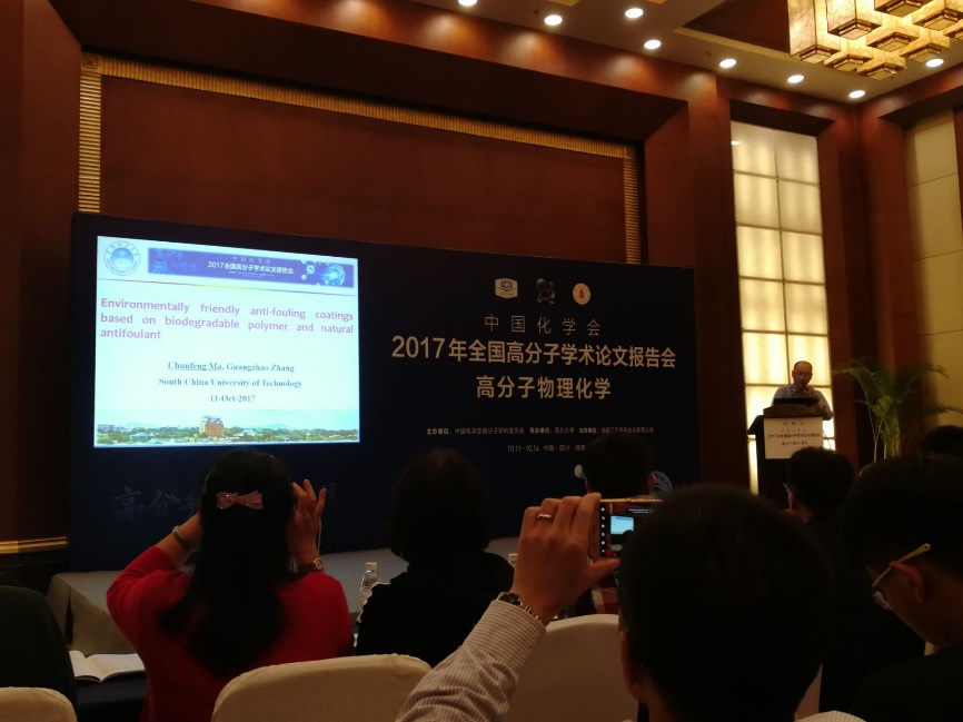 10月10-14日,张广照、马春风、赵俊鹏、龚湘君、汤栋霖等课题组老师,以及五位同学赴四川成都参加2017年全国高分子学术论文报告会。该会议由中国化学会高分子学科委员会主办,是两年一度的国内高分子科学领域学者交流的盛会。本届会议吸引了国内各高校的高分子科学领域的3000余位专家学者参加,共设置20个不同主题的论文报告分会场以及两场墙报展示。 其中,张老师应邀在“高分子物理化学”分会场作题为“动态表面与海洋防污”的邀请报告。报告详细介绍了本课题组研制的动态表面海洋防污材料,该材料可通过主链的降解使表面不断自更新而达到防污目的,可解决传统自抛光材料静态防污能力弱的问题同时由于降解产物为无毒的小分子,避免海洋塑料污染。 马春风老师在“高分子物理化学”分会场作了题为“基于生物降解高分子/海洋天然产物的环境友好海洋防污涂层”的报告,介绍了本课题组在生物降解海洋防污材料的相关研究进展。 龚湘君老师在“高分子物理化学”分会场作了题为“胶体与微生物在高分子界面附近的三维动态行为研究”的报告,介绍了本课题组自行搭建的数字全息显微镜的工作原理和在高分子界面对胶体和微生物进行三维动态行为追踪研究的相关应用。 赵俊鹏老师在“高分子化学”分会场作了题为“有机小分子催化的可控交替共聚”的报告,介绍了本课题组发展的一系列难聚单体的有机小分子催化共聚方法。 汤栋霖老师在“生物基高分子”分会场作了题为“可再生尿素在高性能高分子材料合成中的应用研究”,介绍了本课题组在尿素基高分子材料合成方面的相关研究进展。 在“高分子物理化学”分会场,陈健韬同学作了题为“基于低场核磁技术的聚电解质水溶液离子特异性研究”,介绍了应用质子核磁共振弛豫相关的测试手段对聚电解质溶液的离子特异性的产生机理进行了探究。陈同学对多位专家提出的疑问一一解答,并收获许多宝贵意见。 在墙报展示中,宋其垒、陈烨、王智和周鑫四位同学作了相关展报,向专家学者们介绍了自己的工作和成果,并收获许多宝贵意见。陈烨同学获得了“优秀墙报获奖”。 |