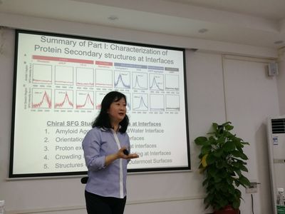 近日,受张广照教授的邀请, 美国耶鲁大学 Elsa Yan教授到本课题组进行访问交流,并进行了题为“Probing Protein Structures at Interfaces by Chiral Sum Frequency Generation Spectroscopy”的精彩学术报告。报告中,Yan教授向师生充分展示了她在生物蛋白质相互作用领域的丰富成果以及对光谱探测蛋白质二级结构研究的深入探索。Yan教授与本课题组师生进行了深刻的讨论,为双方的学术合作打下坚实基础。