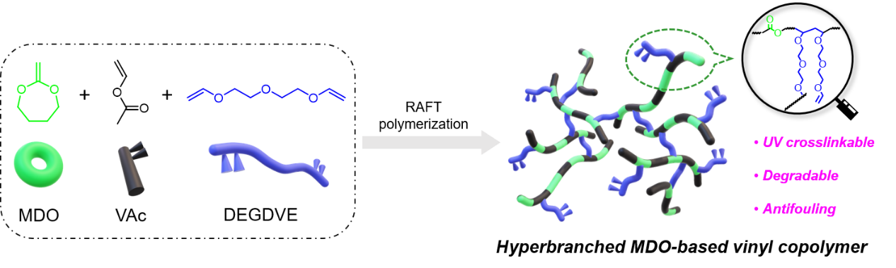 | [研究进展]艾孝青同学通过环烯酮缩醛类单体的自由基开环聚合制备可紫外光固化的可降解超支化防污聚合物 (相关成果发表在Polymer Chemistry) |
