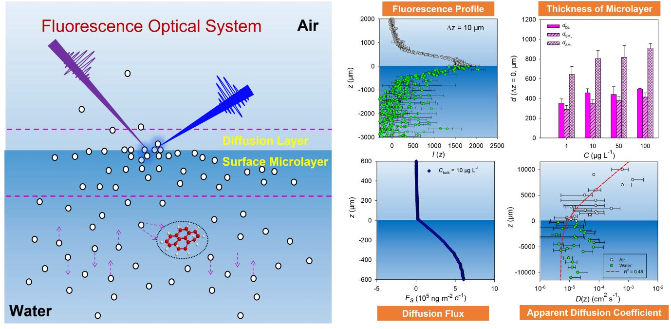 Abstract: Chemical transfer across air-water interface is one of the most important geochemical processes of global significance. Quantifying such process has remained extremely challenging due to the lack of suitable technologies to measure chemical diffusion across air-water microlayer. Herein we present a fluorescence optical system capable of visualizing the formation of air-water microlayer with a spatial resolution of 10 μm and quantifying air-water diffusion fluxes using pyrene as a target chemical. We show for the first time air-water microlayer is composed of a surface microlayer in water ( ~290±40 μm) and a diffusion layer in air ( ~350±40 μm) with 1 μg L-1 of pyrene. Diffusion flux of pyrene across air-water interface is derived from its high-resolution concentration profile without any preemptive assumption, two orders of magnitude lower than those from the conventional method. This system can be expanded to visualize diffusion dynamics of other fluorescent chemicals across air-water interface, and provides a powerful tool for furthering our understanding of air-water mass transfer of organic chemicals related to their global cycling. |
