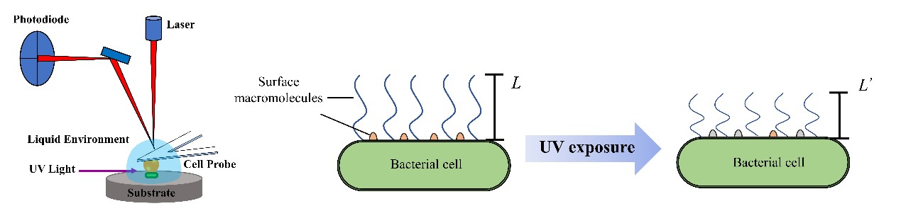 Abstract: It is well established that UV radiation can inactivate bacteria by destroying DNA in the cell envelope, and maintaining the integrity of the cellular membrane. However, how UV radiation changes the surface properties and thus affects bacterial adhesion remain elusive. In this study, single-cell force spectroscopy is employed to examine the surface nanomechanics of Pseudomonas aeruginosa under UV exposure. It shows that P. aeruginosa became stiffer after UV radiation, and its adhesion to silicon surface decreases with rupture length increasing. Nanospring signatures in the retraction force curve become less with lower spring constant but more plateau signatures with higher rupture length appear. These facts indicate the unfolding of the 𝜶-helices of the pili. Besides, the worm-like chain force curves with higher contour length indicate the structural degradation of transmembrane proteins or surface macromolecules obstruction. Accordingly, the bacterial adhesion decreases after UV radiation. DOI:doi.org/10.1002/macp.202300302 |