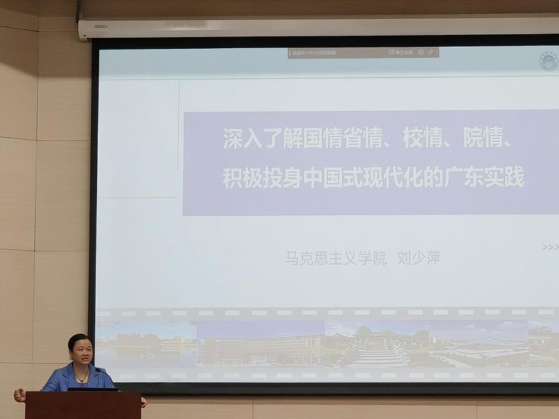 10月12日下午,马克思主义学院党委副书记刘少萍在国际校区C1-b114报告厅为全体2023级硕士新生讲授了题为“深入了解国情、省情、校情、院情,积极投身中国式现代化的广东实践”的新学期“思政第一课”。