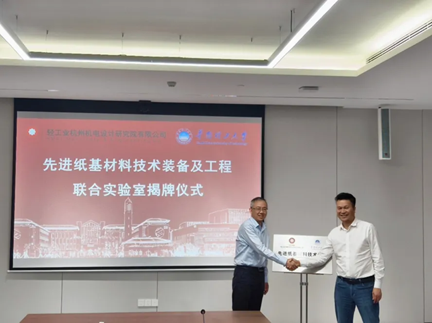 2025年4月22日,华南理工大学与轻工业杭州机电设计研究院有限公司(以下简称“杭机院”)共建“先进纸基材料技术装备及工程联合实验室”成立大会暨揭牌仪式在广州顺利举行。杭机院院长于宏、华南理工大学造纸与污染控制国家工程研究中心(以下简称“中心”)主任胡健等领导出席会议。