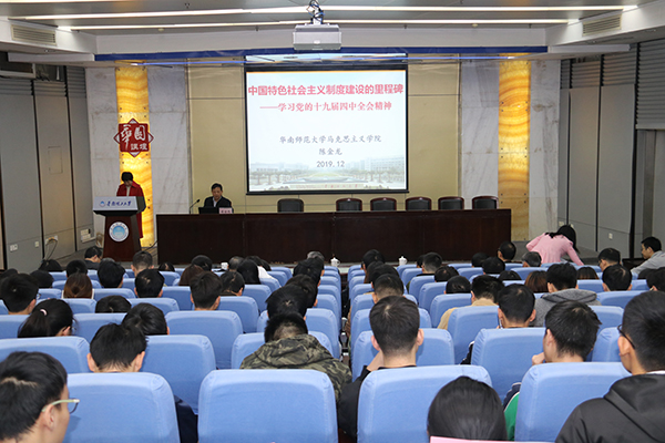 为深入学习宣传贯彻党的十九届四中全会精神,按照党中央、教育部党组和广东省委的部署,12月5日下午,广东省委宣传团成员、华南师范大学陈金龙教授应华南理工大学第43讲“华园讲坛”之邀,为学校师生带来了一场题为“中国特色社会主义制度建设的里程碑——学习党的十九届四中全会精神”的辅导报告。马克思主义学院负责人主持报告会,师生代表、离退休老同志代表、党委宣传部工作人员聆听了报告。