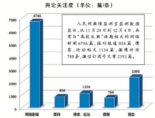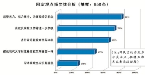 高校反腐相关话题成为目前舆论关注的焦点,统计分析发现广大网民主要有以下几方面观点:81%的网民认为,高校封闭性较强,容易形成“小圈子”,同时由于行政化严重,权力过度集中,监督制约起来有一定难度。72%的网民表示,高校腐败危害巨大,会直接影响下一代的成长,其中招生腐败会直接损害教育公平,后勤腐败则会掣肘教科研水平。65%的网民称,学校的地位不能靠行政级别来维护和树立,要依靠教育与学术成就。去行政化就是让学校回归教育本位,清晰界定政府和学校的权责。47%的网民建议,制度才是大学文化的基石,才能让大学真正拥有健康心灵和“健壮体魄”。高校内部治理结构体系的改革过程,也是高校迈向现代大学制度的过程。加快建设现代大学制度是当务之急。26%的网民提醒道,“象牙塔”内学术不端的行为时有发生,需引起重视。学术腐败的极端表现,就是利用权力、金钱、社会地位等,非法获得学术成果、学术荣誉、学术地位和学术影响力,与贪污受贿犯罪行为无异。(来源:中国纪检监察报 人民网舆情监测室副秘书长 郑光魁)