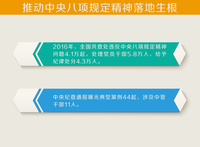 2016年,全国共查处违反中央八项规定精神问题4.1万起,处理党员干部5.8万人,给予纪律处分4.3万人。中央纪委通报曝光典型案例44起,涉及中管干部11人。各级纪检监察机关紧盯年节假期,坚持抓早抓小、串点成线,持续发力加压,强化监督执纪问责,驰而不息正风肃纪,推动中央八项规定精神落地生根。