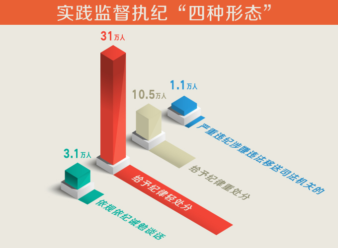 各级纪检监察机关把纪律和规矩挺在前面,实践监督执纪“四种形态”,抓早抓小,动辄则咎,推动管党治党从宽松软走向严紧硬。2016年,全国纪检监察机关共处置反映问题线索73.4万件,初步核实53.4万件次,谈话函询14.1万件次,澄清了结30.5万件次。依规依纪诫勉谈话3.1万人,给予纪律轻处分31万人,给予纪律重处分10.5万人,严重违纪涉嫌违法移送司法机关的1.1万人。
