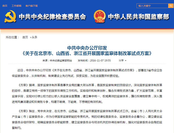 2016年11月,中共中央办公厅印发《关于在北京市、山西省、浙江省开展国家监察体制改革试点方案》,部署在3省市设立各级监察委员会,探索实现对所有行使公权力的公职人员监察全覆盖。12月25日,全国人大常委会通过《关于在北京市、山西省、浙江省开展国家监察体制改革试点工作的决定》。