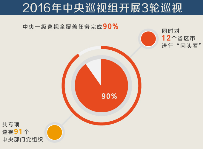 2016年,中央巡视组开展3轮巡视,共专项巡视91个中央部门党组织,同时对12个省区市进行“回头看”。党的十八大以来,中央巡视组共开展十一轮巡视,实现对地方、国有重要骨干企业、中央金融单位、中央和国家机关巡视全覆盖,中央一级巡视全覆盖任务完成90%。