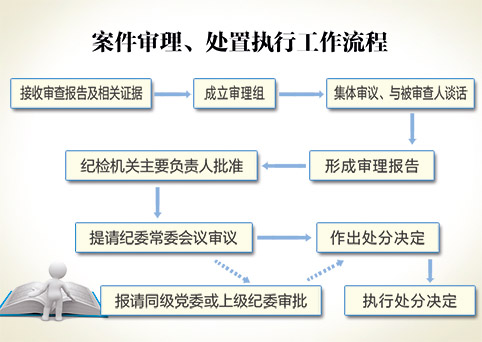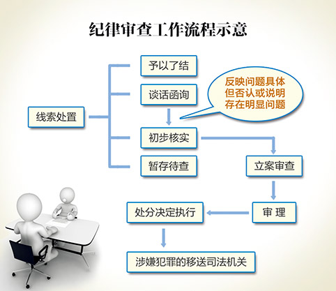 从以上案例可以看出,每起纪律审查案件大致包括线索处置、谈话函询、初步核实、立案审查、案件审理和处置执行等环节。如线索处置决定直接采取初步核实,则会减少谈话函询环节;如涉嫌犯罪,还会增加移送司法机关环节。这些内容,在《工作规则》中都有明确规定。对此,我们可以结合《工作规则》,用以下图表进行说明。