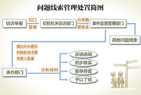 线索处置——指纪检机关对问题线索进行综合分析,按照谈话函询、初步核实、暂存待查、予以了结等方式进行处置。
