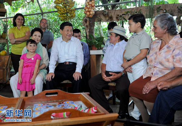 2013年6月3日,习近平和夫人彭丽媛走访哥斯达黎加埃雷迪亚省圣多明哥小镇农户萨莫拉一家,与萨莫拉一家人亲切交流。 新华社记者 张铎 摄