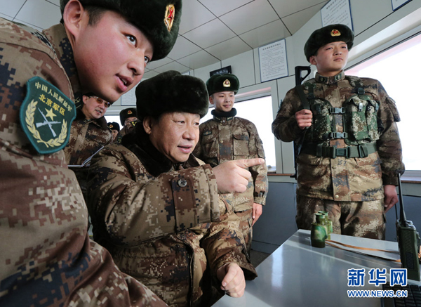 2014年1月26日,习近平专程来到内蒙古军区边防某部,亲切看望慰问戍边官兵。这是习近平仔细察看三角山哨所执勤设施,动情地对执勤哨兵说:“今天,我和你们一起执勤站岗。” 新华社记者 李刚 摄