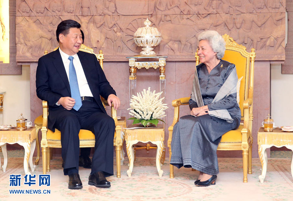 2016年10月13日,习近平在金边看望柬埔寨太后莫尼列。莫尼列太后特意请习近平在西哈努克太皇生前常坐的椅子上就座。 新华社记者 姚大伟 摄