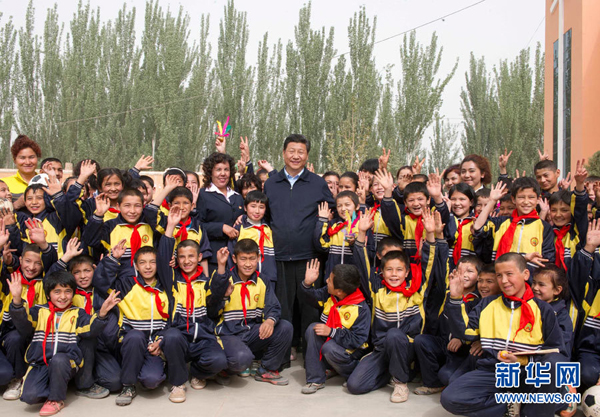 2014年4月28日,习近平在新疆疏附县托克扎克镇中心小学同师生们合影。 新华社记者 谢环驰 摄