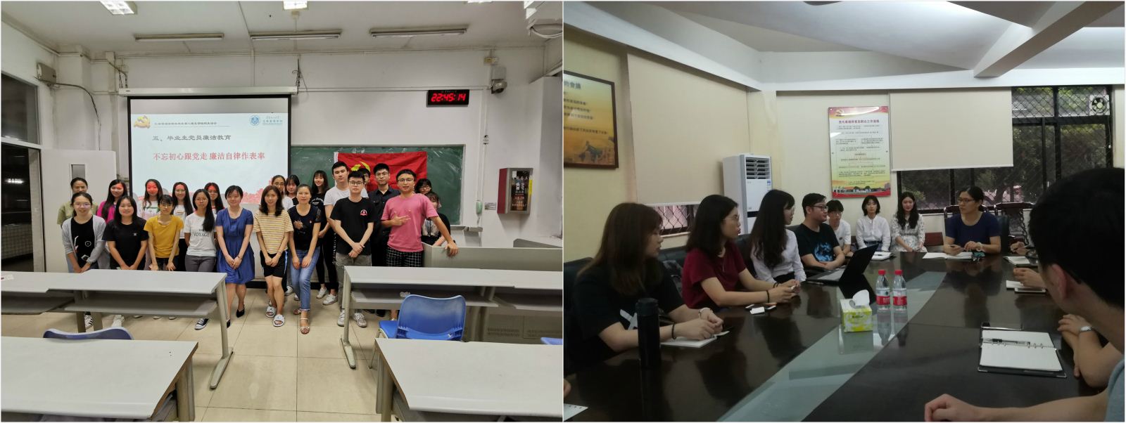 “作为一名共产党员,做人有底线,做事重廉洁,这些不仅对职场生涯大有助益,在自我成长道路上也是警钟。”毕业生党员林世豪在毕业生党员党性教育专题座谈会上坚定说道。学院各学生党支部纷纷创新形式开展廉洁教育,引导他们走好未来的人生路。2019年6月11日晚,本科生第二党支部在320304课室召开“不忘初心跟党走 廉洁自律做表率”毕业生党员廉洁教育专题会议。会议上,党支部书记易红英通过生动鲜活的事例,让毕业生党员感受到廉洁是新时代一种科学的生活方式、新时代青年的行为选择,进一步增强了毕业生的规矩意识,增强了毕业生遵法、崇廉、守信的人生理念。每位毕业生党员也都轮流发表了对廉洁的看法,表示在未来道路做到廉洁修身、秉公执法、牢固树立廉荣贪耻的人生理念。