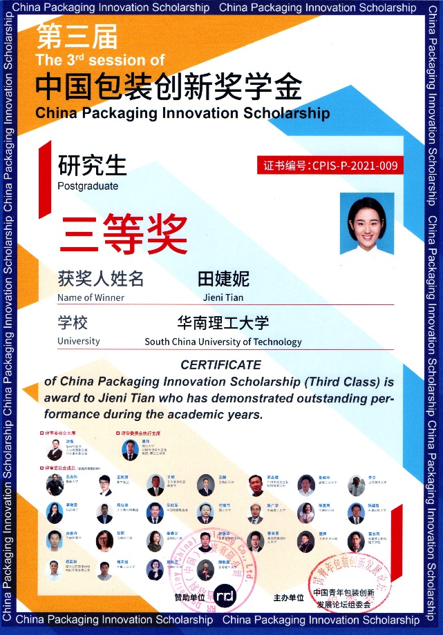 Recently, the 3rd China Packaging Innovation Forum and the 3rd China Packaging Innovation Scholarship Award Ceremony were successfully held in Shanghai. It is hosted by China Packaging Federation, China Youth Packaging Innovation Development Forum Organizing Committee and Wuhan University, and sponsored by RR Donnelley, an international giant in the printing industry. This year, more than 60 students from Wuhan University, Jilin University, South China University of Technology, Hong Kong University of Science and Technology and more than 40 other institutions across China applied for Packaging Innovation Scholarship. Innovation Scholarship graduate group of the first prize 1, second prize 3, third prize 9. Among them, Ling Cai, a 2019 PhD student and Jieni Tian, a master's student from the School of Light Industry Science and Engineering of South China University of Technology, won the first prize and the third prize, supervised by Prof. Chen Guangxue.