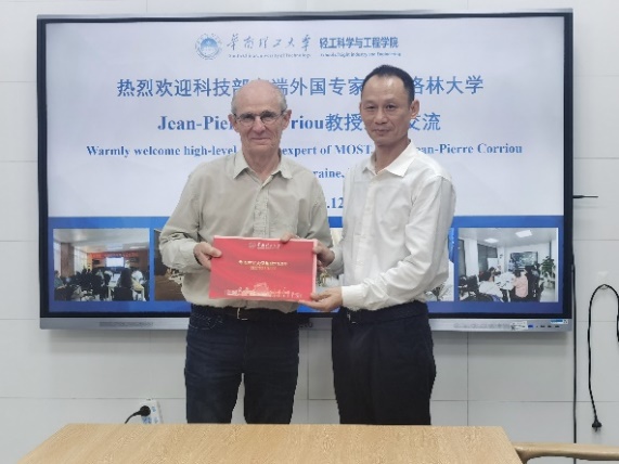 On behalf of the school, the Dean, Prof. Xuehui Li, expressed a warm welcome and sincere thanks to Prof. Corriou, and presented a set of stamps, which are to commemorate the 70th anniversary of the founding of South China University of Technology.
