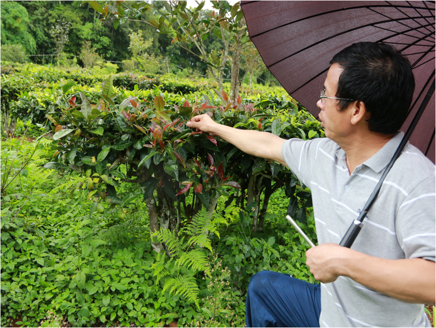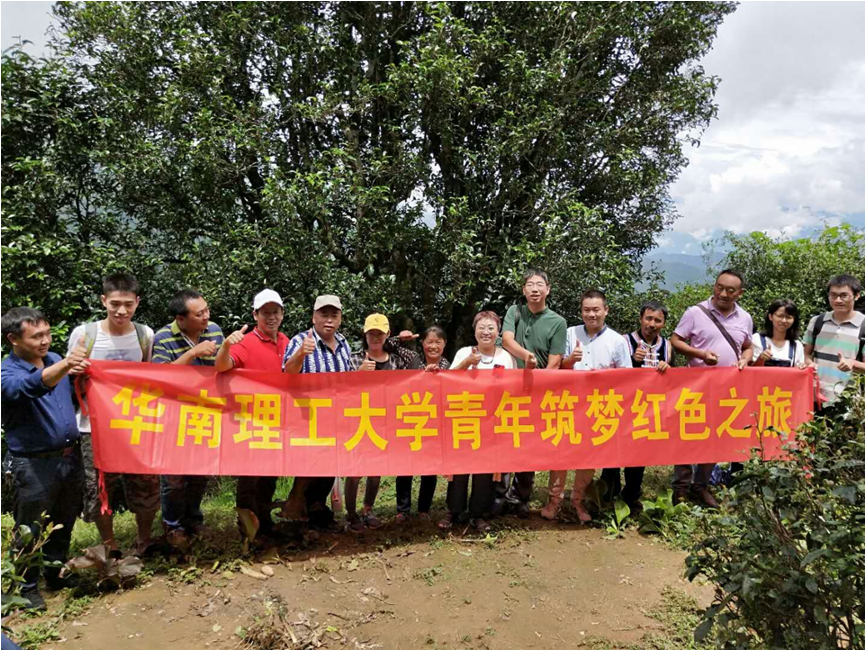 7月18日抵达云南后,在华南理工大学云南校友会的大力支持和帮助下,“爱心茶”团队先后到了普洱市、景洪市、孟连县、勐海县等地的茶山、茶园参观。在勐海茶区,陈荣冒雨给同学们讲解茶叶由绿色自然变异成紫红色、茶叶内含花青素成分增加,同学们现场提出了低温加工茶叶提高茶品质的设想。在参观低品质茶园改造中认真听茶厂厂长讲将老茶树砍枝再嫁接优质品种、3至5年后可以生产优质高端茶产品,同学们深感做事要踏实磨炼、长远规划。在边境茶园,退伍老兵带同学们考察现代茶园中的碉堡、讲解战争时期的壮烈故事,告诫同学们要努力学习、报效祖国。