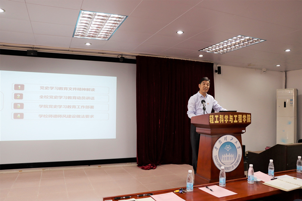 3月25日下午,轻工科学与工程学院召开党史学习教育动员大会,深入学习习近平总书记在党史学习教育动员大会上的重要讲话精神。学校党史学习教育第三巡回指导组组长吴春年等领导和工作人员出席了会议。学院党委书记张建功、常务副院长刘传富、副院长李军、副院长李擘、党委副书记谭循恩,以及在校的学院教职工参加了会议。会议由谭循恩主持。