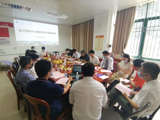 2021年6月23日下午,学院2021届毕业生代表座谈会在造纸楼204会议室举行。学院党委书记张建功、常务副院长刘传富、副院长李擘、党委副书记谭循恩、辅导员、毕业班班主任等老师与毕业生代表们相聚一堂,回顾在轻工学院的学习生活和成长感悟,共同探讨学院的发展和建设。